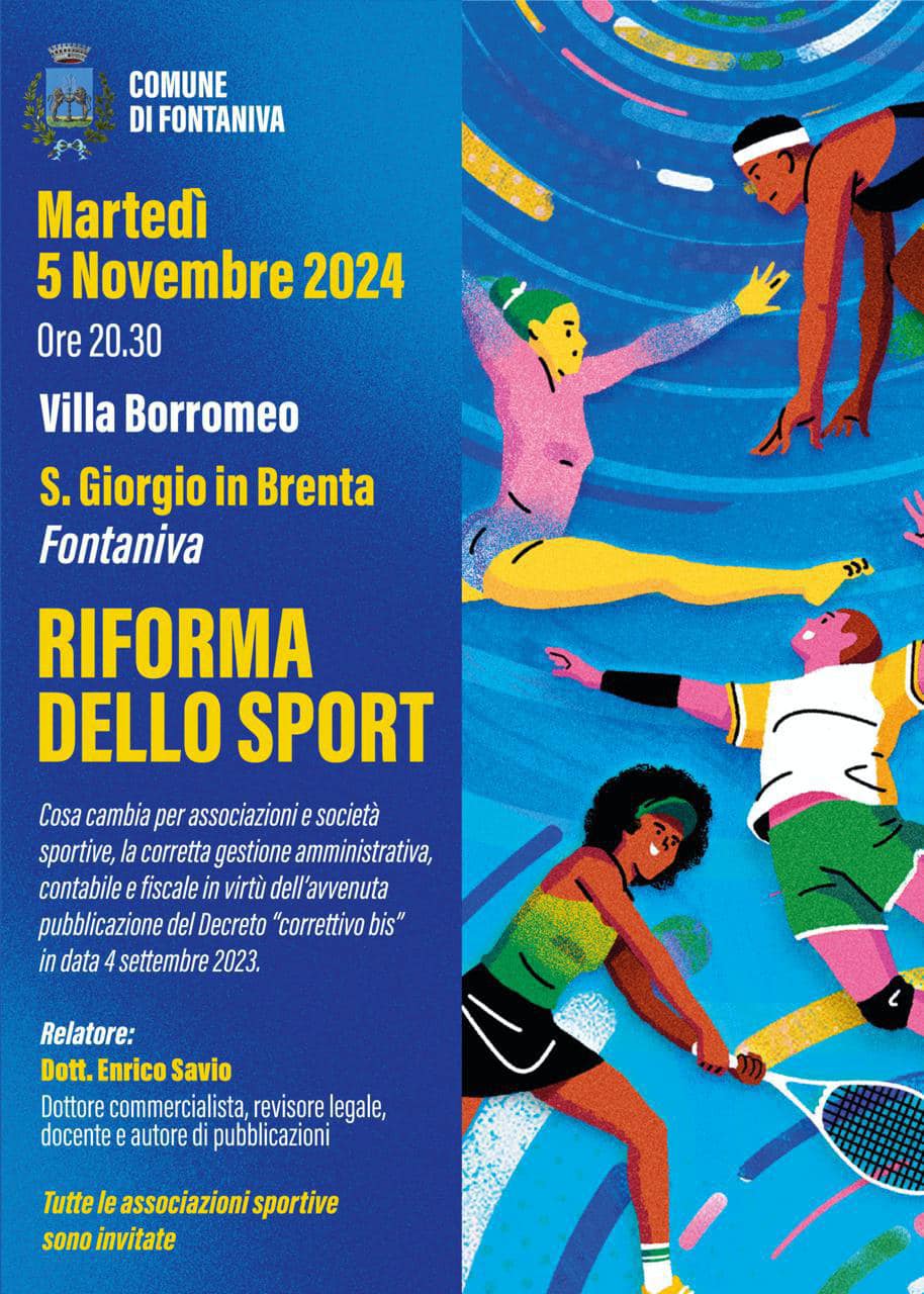 Il Comune di Fontaniva organizza un incontro informativo aperto a tutte le associazioni e società sportive del territorio sul tema della Riforma dello sport, la corretta gestione amministrativa, contabile e fiscale in virtù dell'avvenuta pubblicazione del Decreto "correttivo bis" del 04.09.2023 ⚽️🏀🏈⚾️🥎🥋⛸️🏋🏻♀️🎿🥊